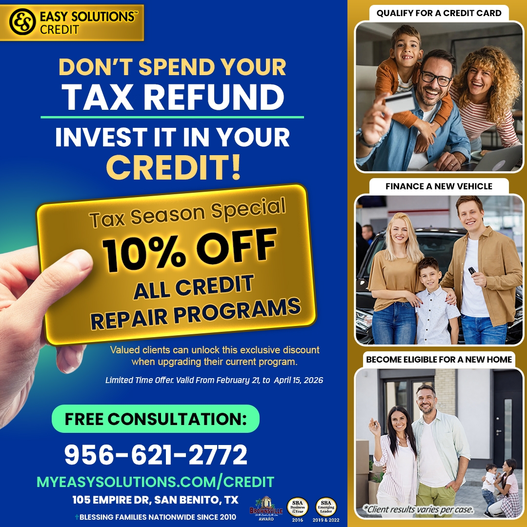 #CreditRepair #TaxSeason #ImproveYourCredit #FinancialFuture #EasySolutionsCredit #TaxRefund #CreditHelp #TexasBusiness #RGV #SanBenitoTX