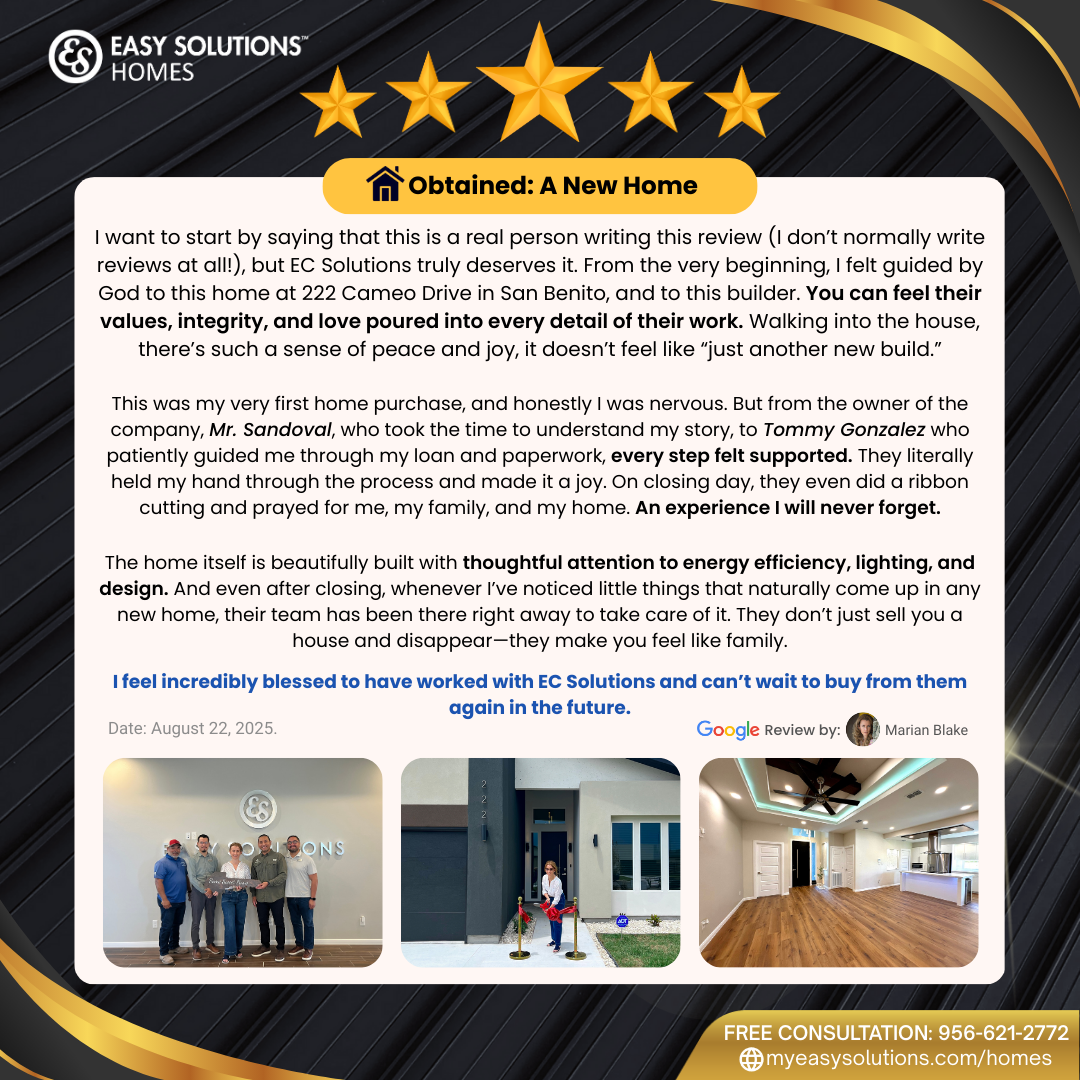 I want to start by saying that this is a real person writing this review (I don’t normally write reviews at all!), but EC Solutions truly deserves it. From the very beginning, I felt guided by God to this home at 222 Cameo Drive in San Benito, and to this builder. You can feel their values, integrity, and love poured into every detail of their work. Walking into the house, there’s such a sense of peace and joy, it doesn’t feel like “just another new build.”