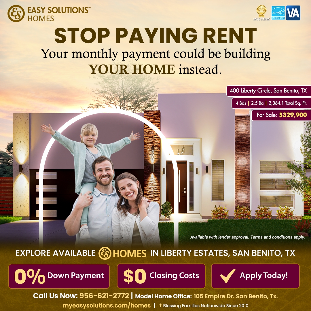 #DejaDeRentar #HazloTuyo #EasySolutionsHomes #LibertyEstates #SanBenitoTX #CasasEnTexas #BienesRaíces #CasaNueva #ConstruyeTuFuturo #CompraTuCasa #PrimerHogar #CasaDeTusSueños